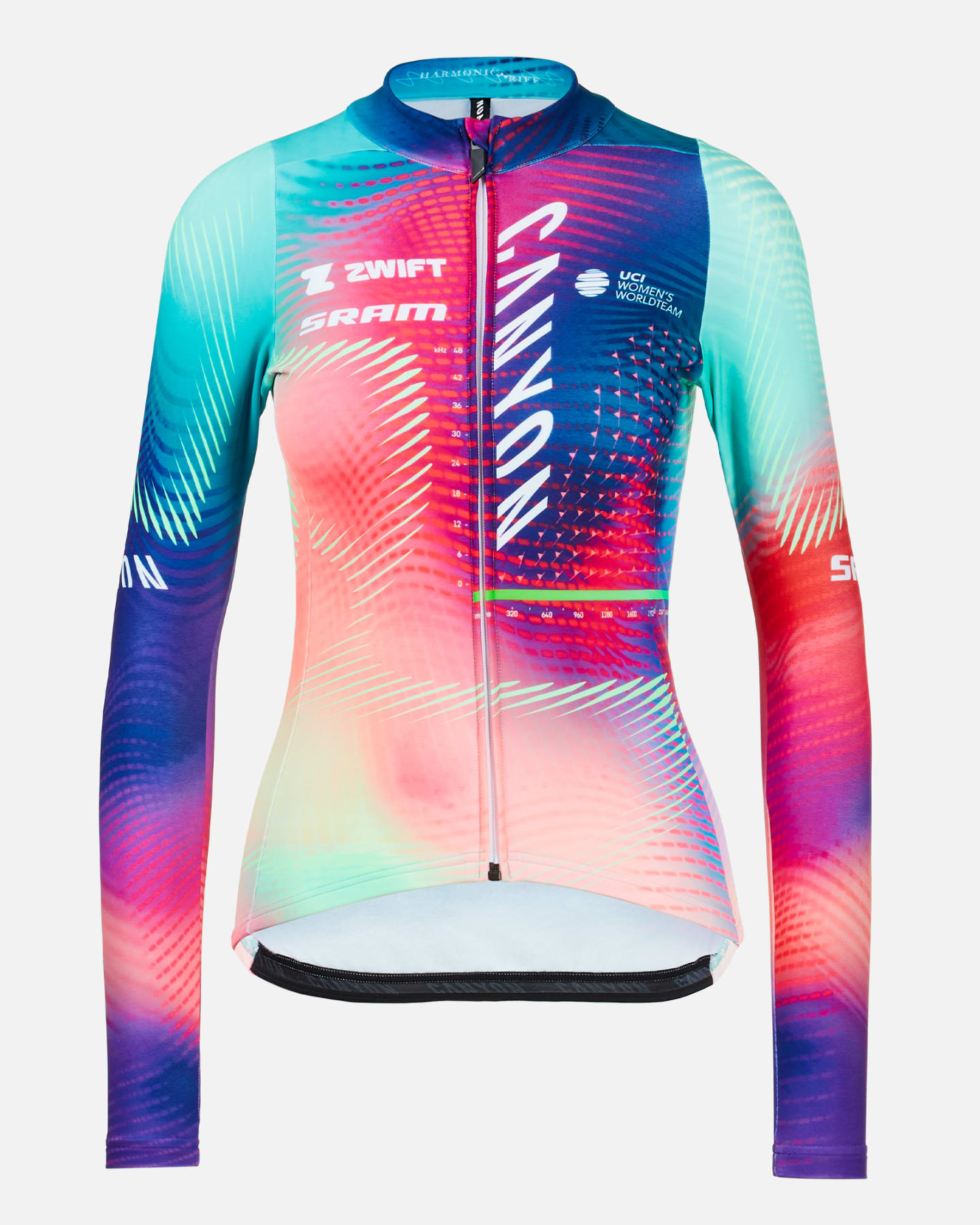 The CANYON//SRAM Racing women's thermal jersey in the new Harmonic Riff design embodies the energy, power and harmony of the CANYON//SRAM Racing team and builds on the incredible moments this team has achieved so far. The brand new design continues the team's reputation as the wearer of the most progressive and distinctive kit in the pro peloton. The jersey features a brushed fleece material on the inside and is perfect as an outer layer for cooler weather or as an insulating mid-layer on very cold days. With its eye-catching new design, women's-specific cut, silicone waistband and three classic back pockets, the CANYON//SRAM Racing women's thermal jersey is a versatile piece for autumn, winter and spring.